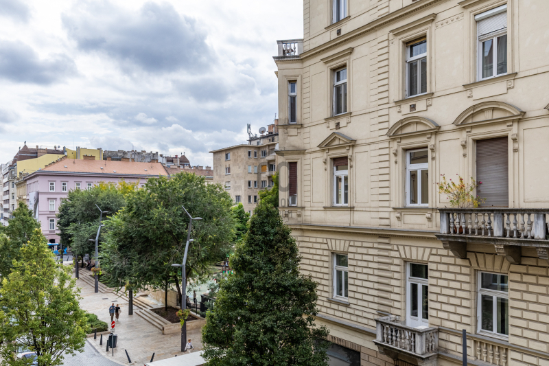 Az utcára néző ablakokból minden nap a belváros gazdagon díszített homlokzatai tárulnak fel. Ez a látvány folyamatos párbeszédet teremt a lakás modern, letisztult belső világával: a klasszikus polgári építészet részletei és a kortárs design tiszta vonalai együttese ad különleges élményt, amely egyszerre idézi meg a múlt értékeit és a jelen kifinomultságát.