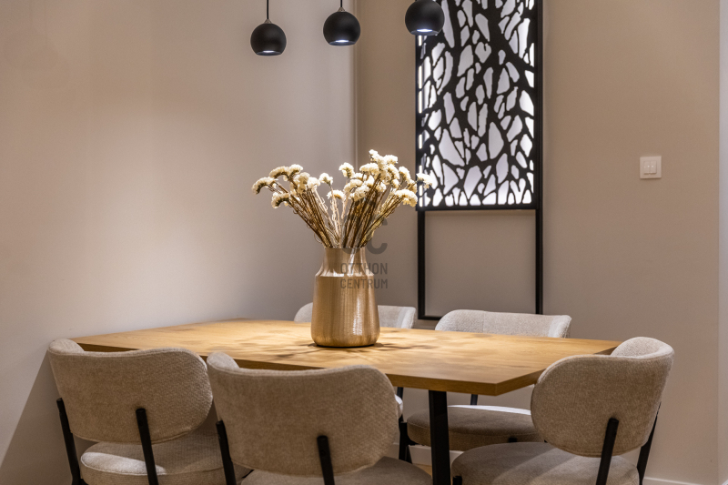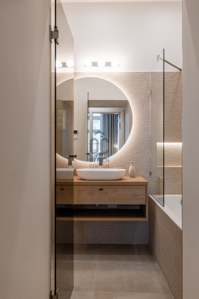 A lakás teljes felújítása során a polgári szerkezet nagyvonalú arányait ötvözték a modern otthonok kényelmével és kifinomult esztétikájával. A nappali világos, tágas tér, amelyet a nagyméretű ablakokon át beáradó fény és a visszafogott színek harmóniája tesz különlegessé. A konyha elegáns fekete és natúr fa kombinációban készült, beépített gépekkel és rejtett világítással, amely egyszerre esztétikus és funkcionális. A három különnyíló hálószoba neutrális tónusokkal és természetes fa padlóval biztosít nyugodt, kiegyensúlyozott atmoszférát. A két fürdőszoba olasz burkolatokkal, modern szaniterekkel és LED-világítással készült – egyik káddal, másik walk-in zuhannyal, a legmagasabb komfortérzetet kínálva.