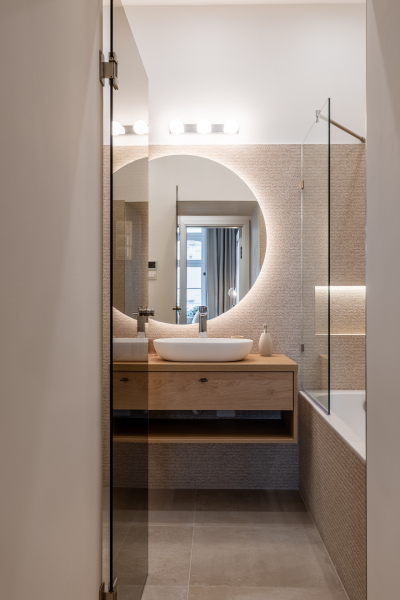 The two bathrooms feature Italian tiles, modern fixtures, and LED lighting — one with a bathtub, the other with a walk-in shower — providing the highest level of comfort.