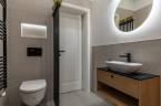 The kitchen features a stylish combination of matte black and natural wood, fully equipped with built-in appliances and hidden lighting — both functional and visually striking.