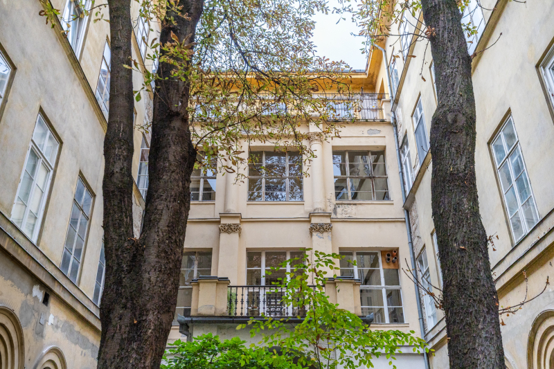 The façade radiates dignity, the spacious inner courtyard creates a pleasant, intimate atmosphere, and the staircase retains original architectural details from the era.