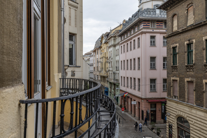 From the balcony with its decorative wrought-iron railing, you can enjoy the charming streetscape of Királyi Pál Street.