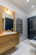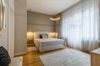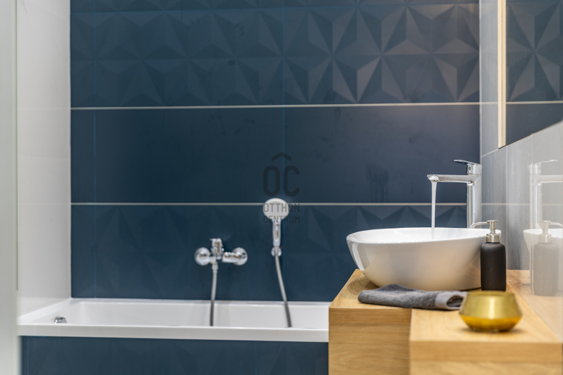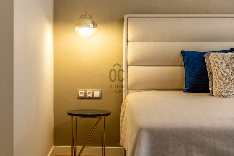Az első emeleti, 79 m²-es lakás teljes körű felújításon esett át, ahol a polgári terekhez modern belsőépítészeti megoldások társulnak. A konyhában a matt fekete és natúr fa kombinációja jelenik meg, beépített üveg vitrinnel és rejtett LED-világítással, míg a nappalit világos tónusok, tölgyfa parketta, valamint fekete és arany részletek határozzák meg. A hálószobák letisztult színvilága meleg tónusú faburkolatokkal, textúrált szövetekkel és design függesztett körlámpákkal teremt nyugodt, mégis karakteres atmoszférát. A két fürdőszobát mély tengerkék, 3D hatású burkolatok, olasz szaniterek, walk-in zuhanyok és modern fa–fehér felületek teszik elegánssá. Az utcára néző, kovácsoltvas korláttal díszített erkélyről a Királyi Pál utca hangulata tárul fel. Az ingatlan minden részletében átgondolt: a prémium anyaghasználat, a harmonikus színvilág és a gondosan kialakított terek egyszerre sugároznak eleganciát és biztosítanak funkcionális kényelmet.