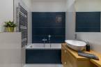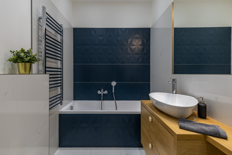 Both bathrooms are styled with deep ocean-blue 3D-effect tiles, Italian sanitaryware, walk-in showers, and refined white-and-wood finishes.