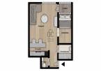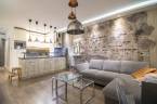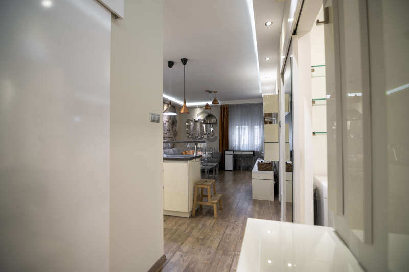 A felújított, 40 m²-es, II. emeleti lakásba belépve a nappali és konyha egyterű kialakítása azonnal kellemes, tágas érzetet ad.