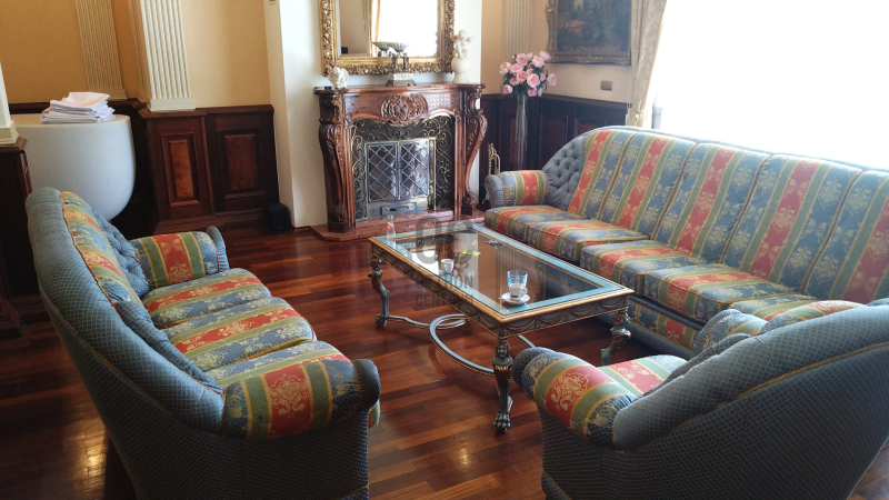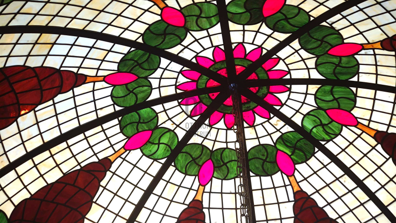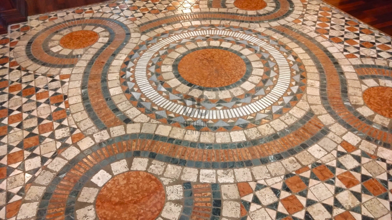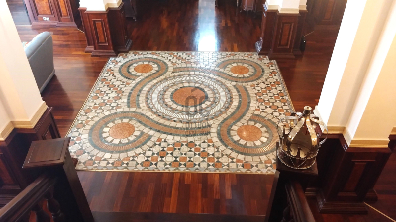 A házba belépve egy impozáns, 120 nm-es nappaliba érkezünk, ahol a padlón egy 14 nm-es római mozaikot, a fejünk fölött pedig egy gyönyörű ólomüveg kupolát láthatunk.