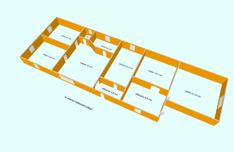 Itt egy előtérből léphetünk a konyhába és a tágas nappaliba. A nappaliból két szoba, fürdőszoba és wc nyílik.