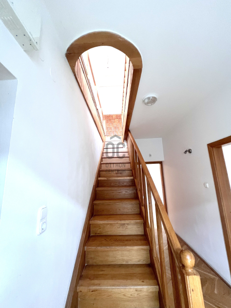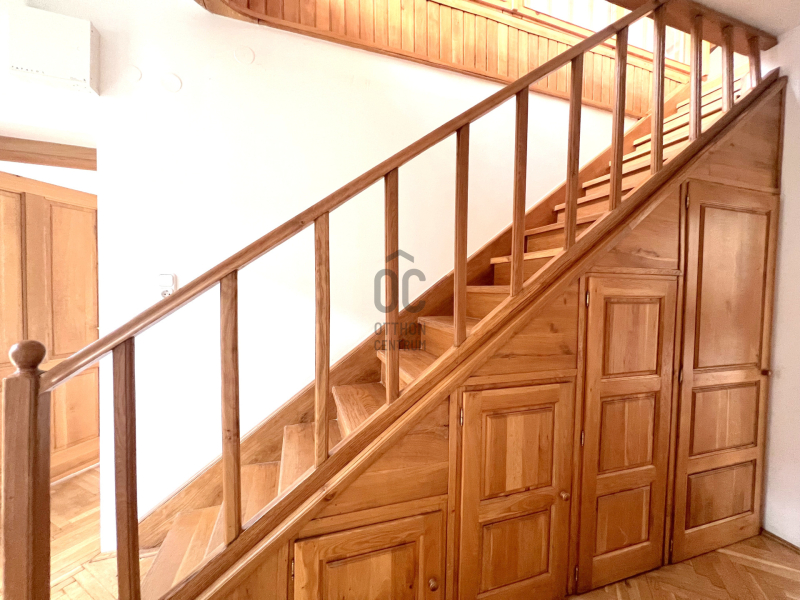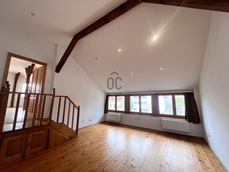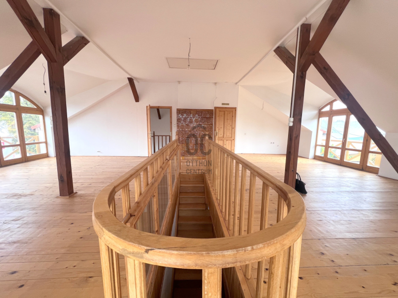 A földszinti helyiségekben a nagy belmagasság és a fa részletek különleges térérzetet teremtenek, ami ritkaság a környéken.