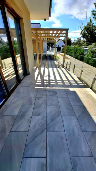- a 6,2 * 2,1 m-es, részben fedett, járólapozott, dizájn üvegkorláttal szegélyezett terasz, biztosítja a pihenést, a kávézást, de akár a szabadban történő étkezés lehetőségét is