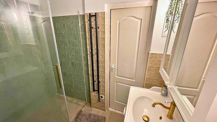Szomszédságában találjuk az épített zuhanyzóval és mosdóval szerelt fürdőszobát és a külön wc-t.