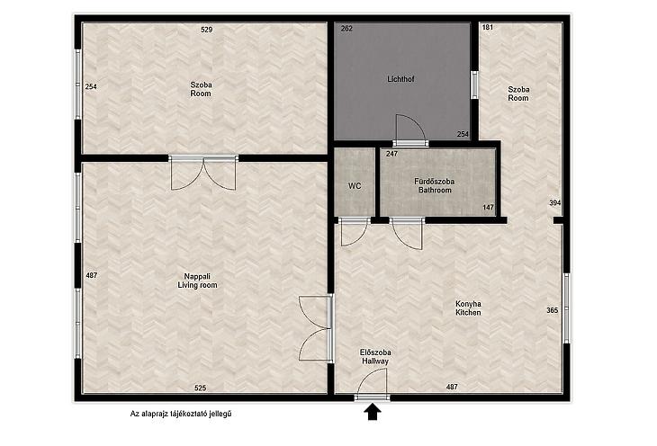 A lakásban egy tágas nappali és két hálószoba került kialakításra. A központi térben kapott helyet az ablakos, ideális méretű, modern étkezős konyha.