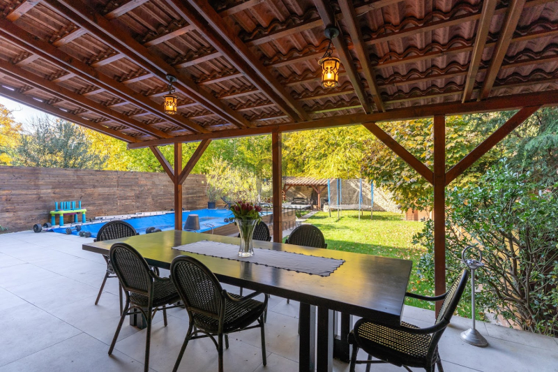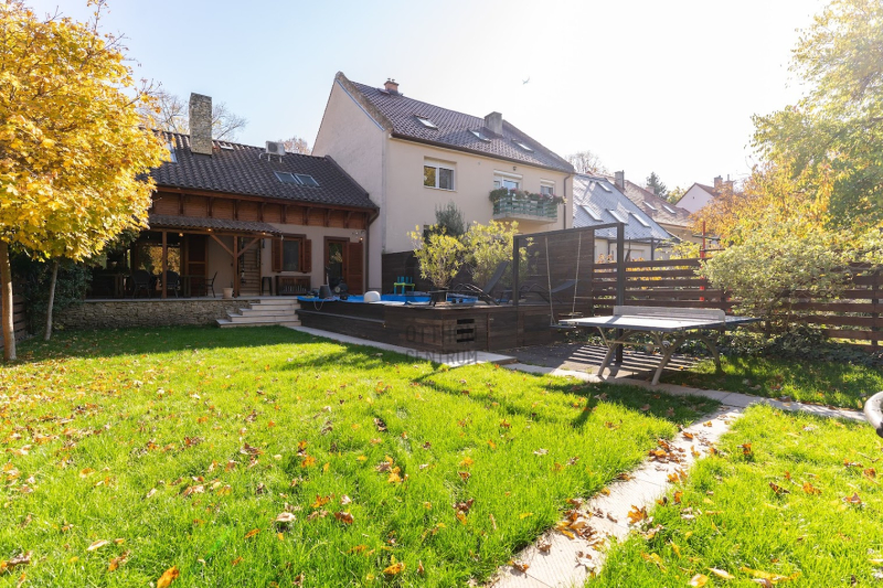 A házhoz tartozik egy 403 négyzetméteres telek, amely rendezett kerttel rendelkezik. A füvesített kertben kiépített öntözőrendszer, 3x5 méteres hőszivattyúval fűthető medence, fedett sütögető rész és egy kis faház tárolónak is megtalálható.