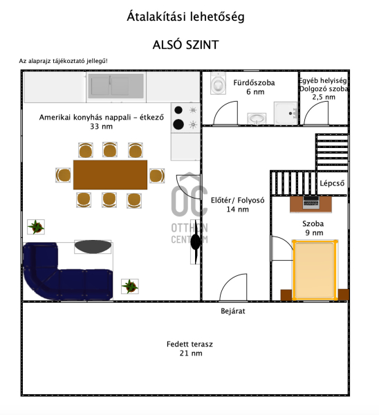 - a földszinten össze lehet vonni az étkezőt és a nappalit és egy AMERIKAI-KONYHÁS-ÉTKEZŐS-NAPPALIT lehetne ott létesíteni