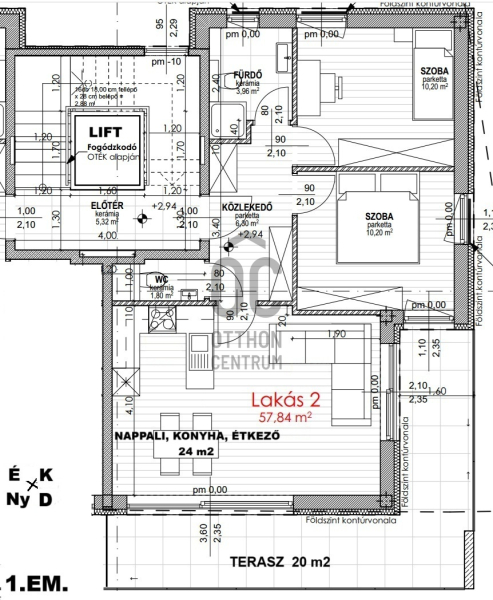 1.E.: 2 db 68 m2-es (20 m2 terasz 1/2 méretének a beszámítása mellett. A terasz nélküli nettó alapterület 58 m2), DNY-i, 3 szobás, 2 db teremgarázs hely (+10 Mft/db), és 4,5 m2 tárolóval (+4,5 Mft)