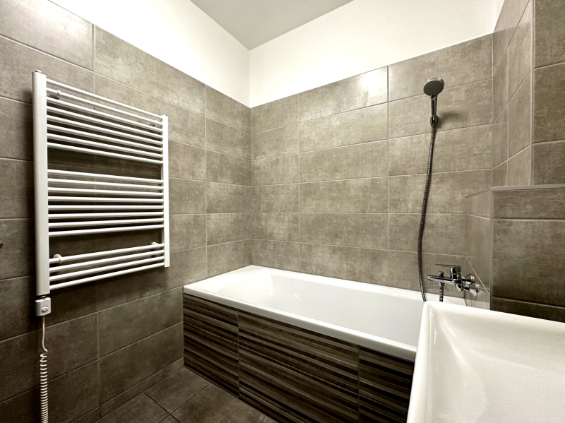 - Magas minőségű és esztétikus anyagokkal, igényes burkolatokkal, prémium Laufen szaniterekkel, Hansgrohe csaptelepekkel készült.