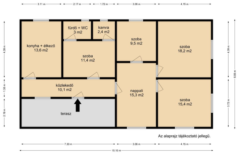 4 külön nyíló szoba, tágas nappali, konyha-étkező, fürdő–WC, kamra, közlekedő és egy kellemes terasz alkotja