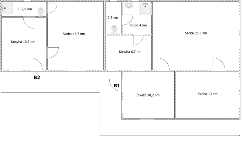 -az első részben két szoba, étkező, konyha és fürdő található ( ~ 65 nm)