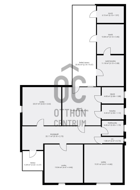 •Lakóház: 116 m² (Tároló + teraszok: 59 m²)