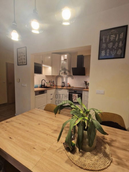 Eladó a 10.kerületben Kőbányán egy 2008-ban épült liftes társasház 1. emeletén, egy 79 nm-es, praktikus elosztású, igényes, 3 szobás, külön Wc-vel, kamrával és dupla erkéllyel is rendelkező, kitűnő állapotú lakás. Tágas és erkélyes nappaliján kívül, két szintén tágas hálószobával (melyek egyike szintén erkélyes), amerikai konyhával, kádas fürdővel, előszobával, külön Wc-vel és kamrával rendelkezik. A keleti tájolású nappali és az egyik szoba csendes utcára, míg a másik, nyugati tájolású szoba belső kertre néz. Az ingatlan egy éven belül teljes felújításon esett át, melynek keretében valamennyi burkolat cserére került, megújult a fürdő, a Wc, és új (még bőven garanciális) gépesített konyhabútor került beépítésre. További tárolást elősegítő szekrények is beépítésre kerültek, melyek a vételárban benne foglaltatnak. A nyílászárók műanyagok és redőnnyel felszereltek, a padlófűtést egyedi méréssel házközponti kazán látja el. A nemrégiben kamerarendszerrel és új postaládákkal valamint friss lépcsőházi festéssel ellátott három szintes szigetelt társasház nagy belső udvarral rendelkezik, mely játszótérrel is rendelkezik. A közös költség átlagban 25 000 Ft, mely a fűtési és vízmelegítési díjat is magában foglalja. Az utcai parkolás megoldott, de igény esetén a házban garázshely és felszíni beálló egyaránt vásárolható vagy bérelhető. A környék ellátottsága mind szolgáltatások, mind közlekedés tekintetében remek, iskolák, óvodák, orvosi rendelők, gyógyszertárak, üzletek, a kerület központja és busz valamint villamos és vasúti közlekedés is sétatávolságon belül találhatóak.
