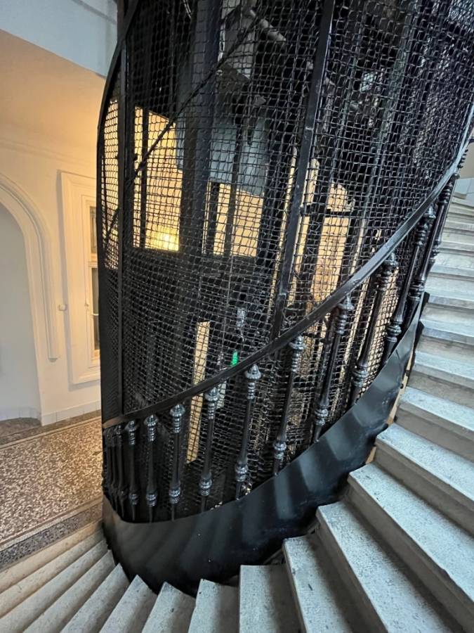 A lépcsőház kifinomult kovácsoltvas korlátokkal, mozaik padlózattal és márvány lépcsőkkel kialakítva.