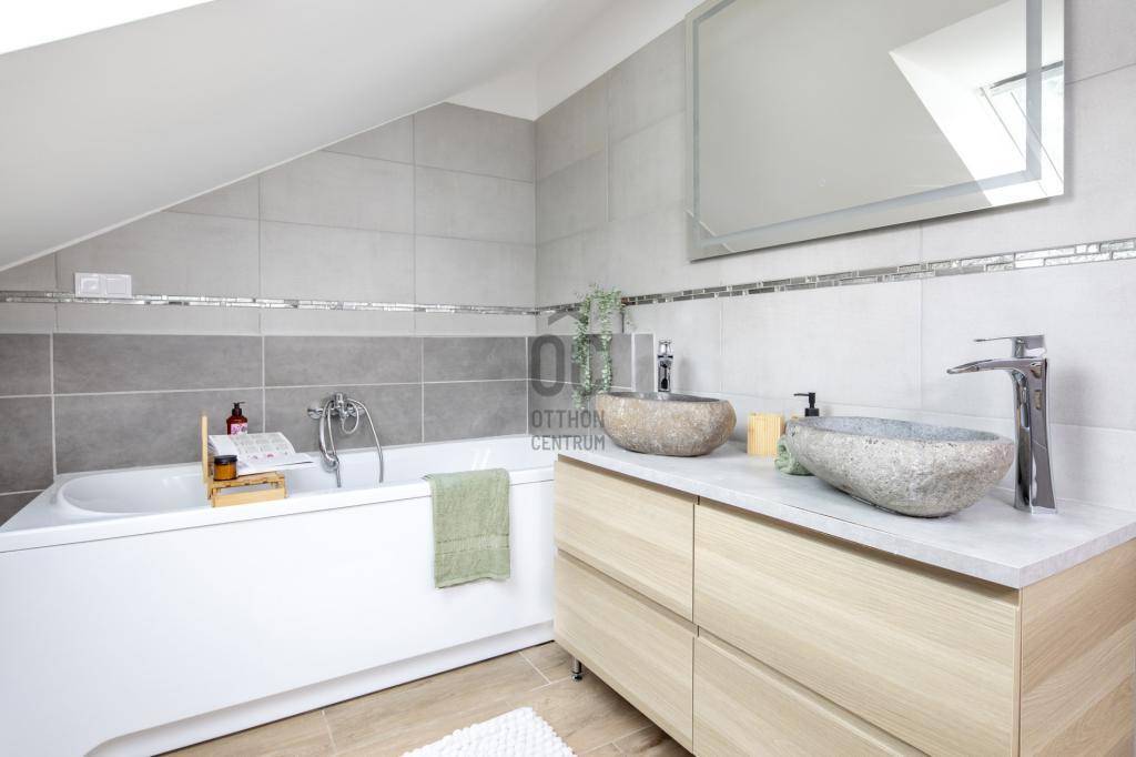 Az emeleten fűrdőkádas dupla mosdószekrény kényelmes a mindennapokban. Hangulata fantasztikus....