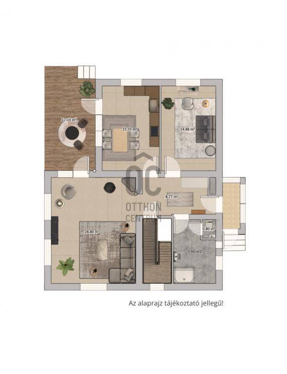 A nappali és konyha étkezeővel teraszkapcsolatal rendelkezik.