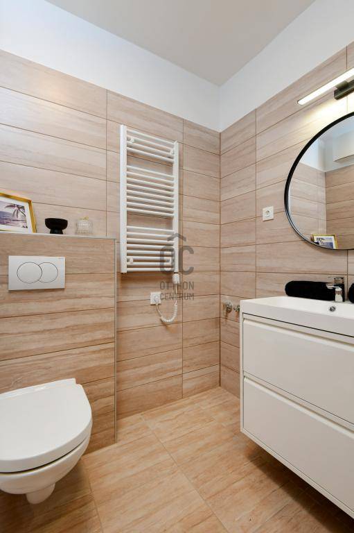 A lakás klimatizált, a hatalmas üvegfelületeken árad be a napfény, nyugati tájolású.