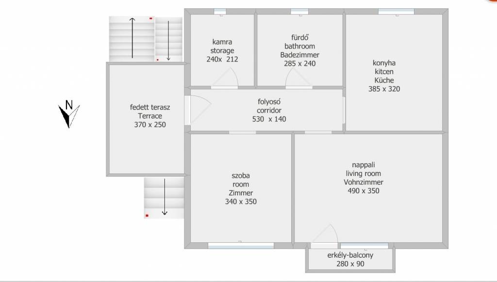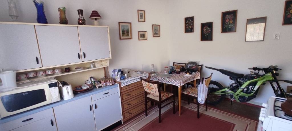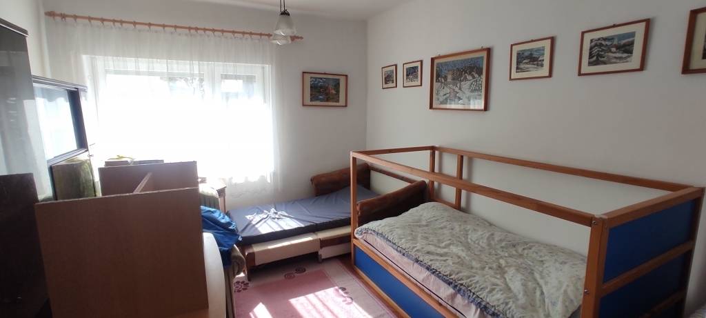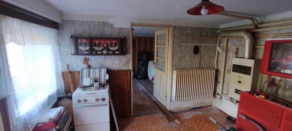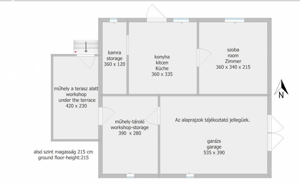 A felső lakószinten 2 szoba, nagy konyha-étkező, erkély, fürdő és előszoba, spájz található. Lenn pince, terasz, garázs, műhely.