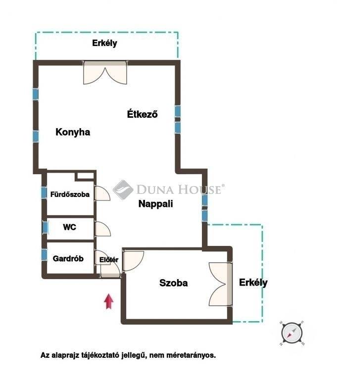 A 44 m²-es otthon barátságos elrendezésű: amerikai konyhás nappali, hálószoba, kádas fürdőszoba, külön WC, kis gardrób helyiség, két erkély, ahonnan a belső kertre nyílik kilátás.