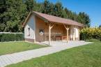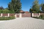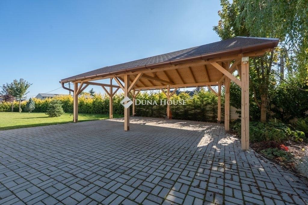 Térkövezett bejárón tudunk kényelmesen ráfordulni a fedett dupla autóbeállóra.