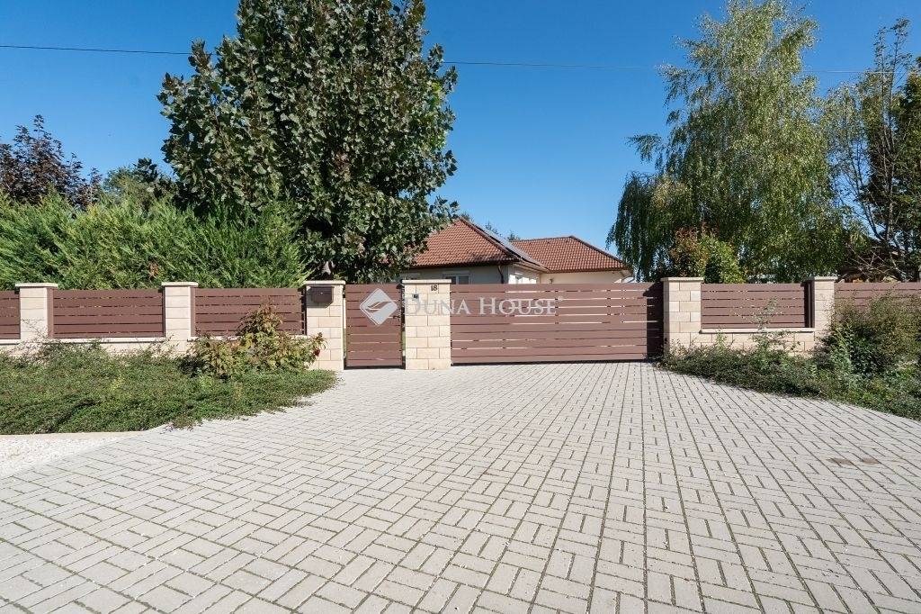 A telek igényes kerítéssel körbekerített, az utcafrontról széles úszókapu nyílik.