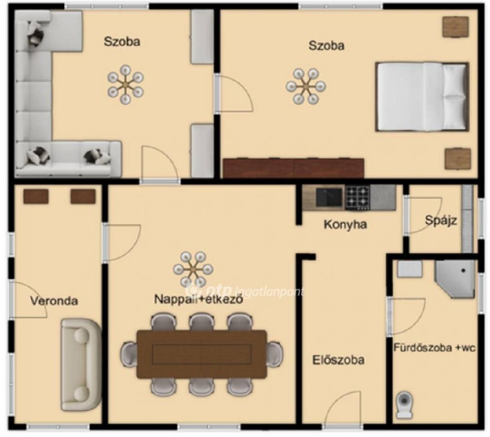 -kiváló fekvéséből adódóan világos beltérrel találkozunk amelyben : előszoba , 2 szoba , nappali , konyha , veronda , fürdőszoba+wc található.