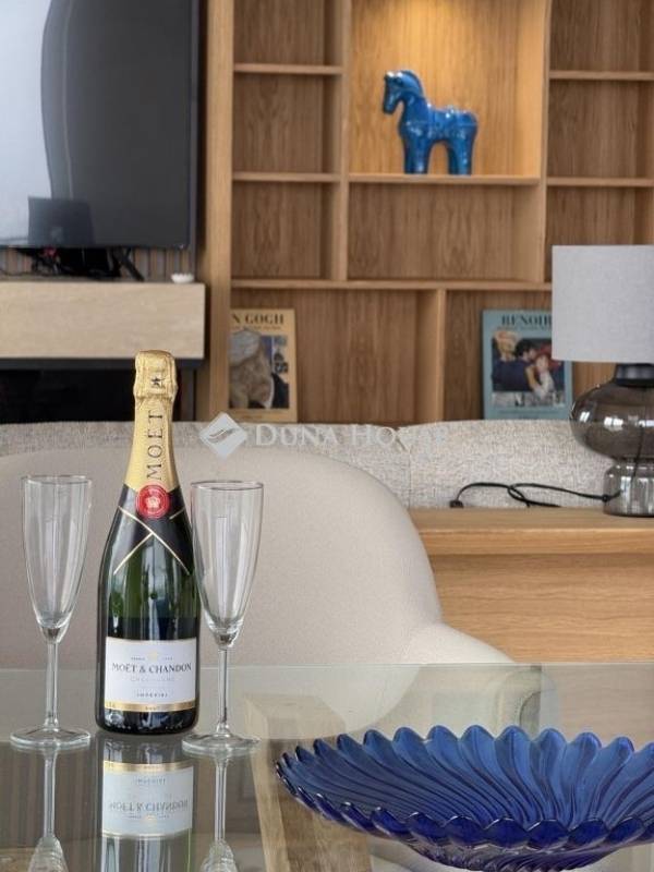 A tágas, világos amerikai konyhás nappali padlótól plafonig érő üvegfelületeivel természetes fénnyel telik meg, miközben a Duna látványa mindennap élvezhető. Az egyedileg tervezett, teljesen gépesített konyha márványhatású munkalappal és prémium beépített gépekkel felszerelt, ahol a funkcionalitás és az esztétika tökéletesen találkozik.