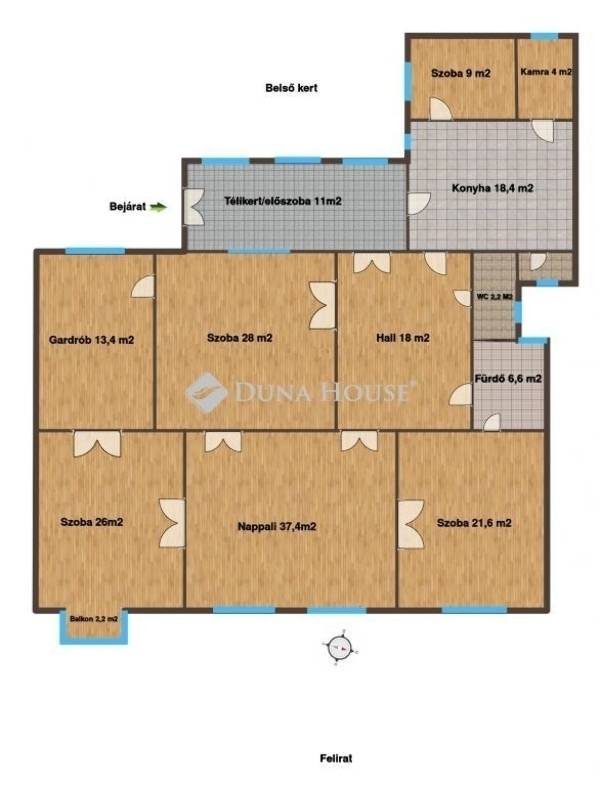 A 37 m²-es nappali és a több, különnyíló szoba világos, ÉK és DNy tájolású, utcai és belső kertre néző ablakokkal.