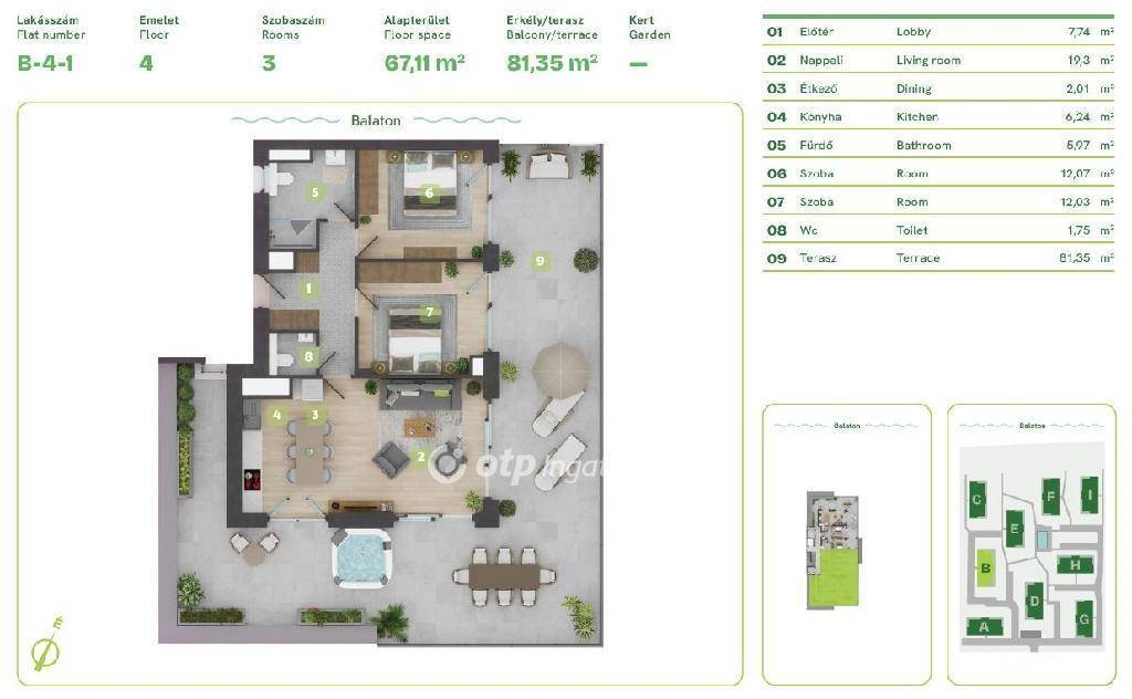 Balaton Déli part, Balatonszemes, közvetlen vízparti, 108 m2 panorámás penthouse lakás eladó. Az ingatlan a Balaton egyik legszebb vízparti lakóparkjában, természetes zöld környezetben található. A környezettudatosan épült, panorámás kilátást nyújtó, modern épületek esztétikailag és a fenntarthatóság szempontjából is kiemelkedőek, egyszerre biztosítják a kényelmes otthont és a balatoni életstílust. A különböző lakástípusok lehetőséget adnak arra, hogy minden lakó megtalálja a számára tökéletes otthont, akár az Otthon Start Hitelprogram keretében is. A földszinti lakások terasszal és kertkapcsolattal rendelkeznek, az épületek felső emeletén penthouse lakás került kialakításra. Ehhez a 67 m2-es, balatoni panorámás 4. emeleti lakáshoz kis tároló és egy 81 m2-es tetőterasz tartozik. A lakópark nem csak elhelyezkedése miatt egyedi, minden egyes lakás a legújabb intelligens technológiával, magas minőségű és igényes alapanyagokkal, prémium extrákkal kerül kialakításra. Egyszerre komfortosak és energiahatékonyak: elektromos redőnyök, szúnyogháló, egyedileg vezérelhető hőszivattyús, fan-coilos hűtési és fűtési rendszer, okosotthon rendszer, beléptető rendszer, riasztórendszer. Az ingatlan értékét növelik a következő szolgáltatások: a területen kialakított gondnoki, üzemeltetési iroda; zöldterületbe illesztett játszótér; zárt, privát vízpart több, mint 130 méteren; partmenti stég; közel 120 m2 vízfelületű strandmedence 16 m2-es gyermekpancsolóval; automata öntözőhálózat a lakóépületek közötti zöldfelületek öntözésére. OTP Ingatlanpont és Pénzügyi Pont irodánk teljeskörű támogatást nyújt az ingatlan kiválasztásával, megvételével, biztosításával és finanszírozásával, akár egyedi kedvezményes hitelekkel, befektetési lehetőségekkel kapcsolatban is. Bővebb információért keressen telefonon! M316170