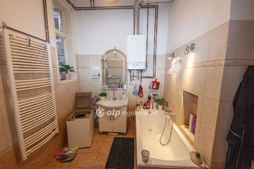 A felújítás elkezdődött a fürdőszobában már a radiátor mellett padlófűtés is van, újak a szaniterek és a burkolat. A lakás fűtéséről és a melegvíz ellátásról új kombinált kondenzációs gázkazán gondoskodik, de egy cserépkályha is rendelkezésre áll.