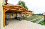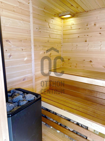 Udvari helyiségek: egy bicikli tároló, két állásos garázs, wellness részleg sóterápiás szaunával és dézsafürdővel.