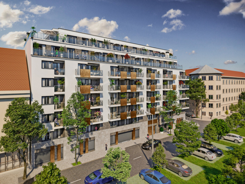 Eladó a XIII. kerületben, a Szegedi út és Üteg utca sarkán, a Béke Garden új építésű, modern társasházban egy 5. emeleti, rendkívül világos és csendes lakás, amely a ház belső, zöld, fás kertjére néz.