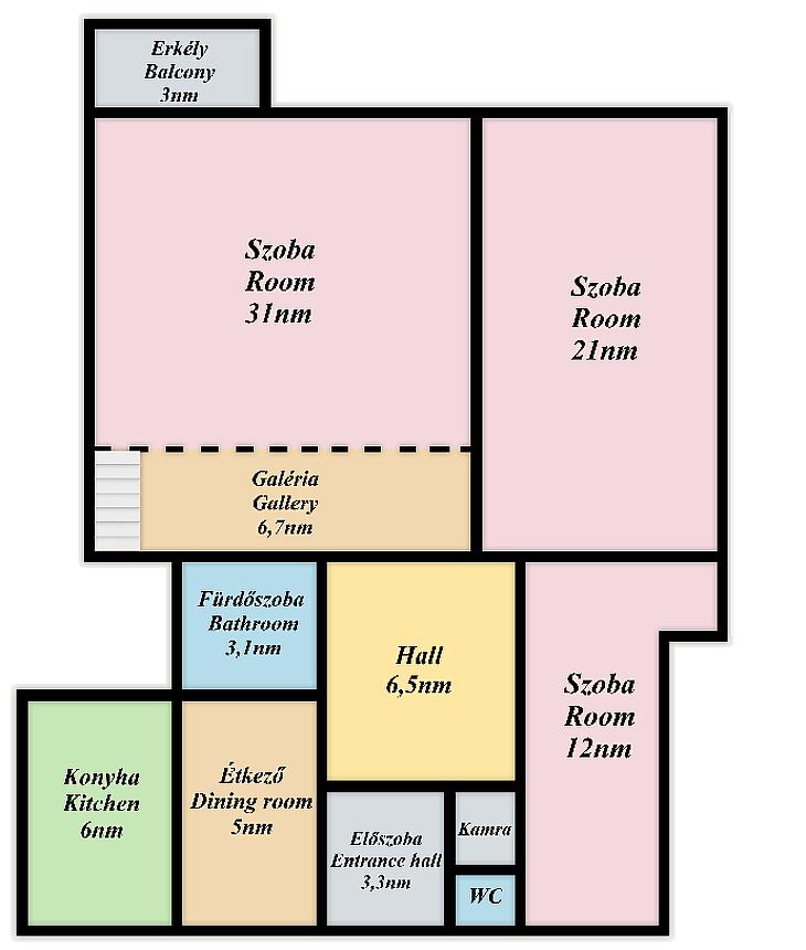 A lakás elrendezése praktikus: a 31 m²-es, galériás nappalihoz erkély kapcsolódik, a tágas hálószobák és a konyha–étkező rész jól elkülönülnek. A keleti fekvésnek és a nagy belmagasságnak köszönhetően a terek világosak és szellősek.