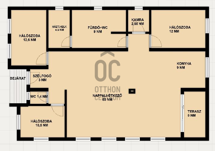 -Tágas nappali–konyha–étkező, közvetlen teraszkapcsolattal