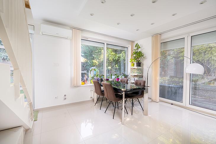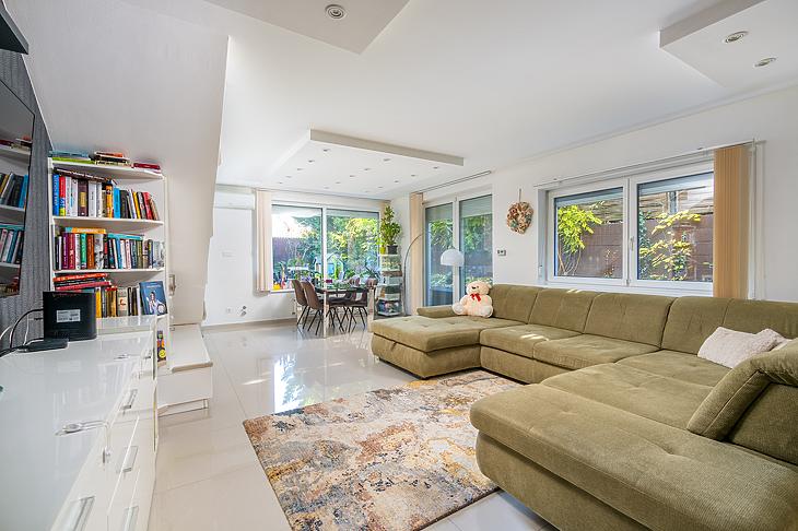Csillaghegy DUNA FELŐLI oldalán csendes utcában ELADÓ egy 107 négyzetméter alapterületű belső kétszintes lakás 100 négyzetméteres KERTKAPCSOLATTAL!