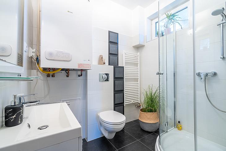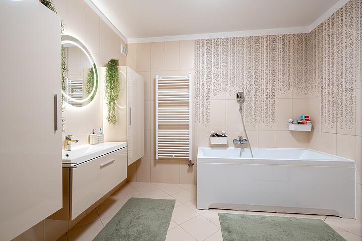 A fűtésről kondenzációs kazán és az összes helyiségben padlófűtés, míg a nyári melegben a hűségről két inverteres klíma gondoskodik.