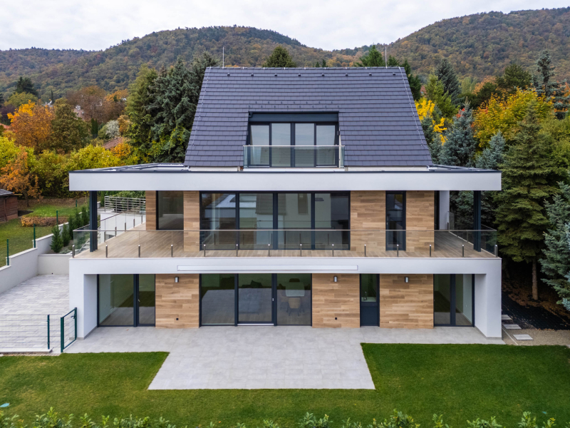 A homlokzatot világos tónusok, természetes fa részletek és nagy üvegfelületek jellemzik, melyek a nappali terekbe áramló fényt még hangsúlyosabbá teszik.