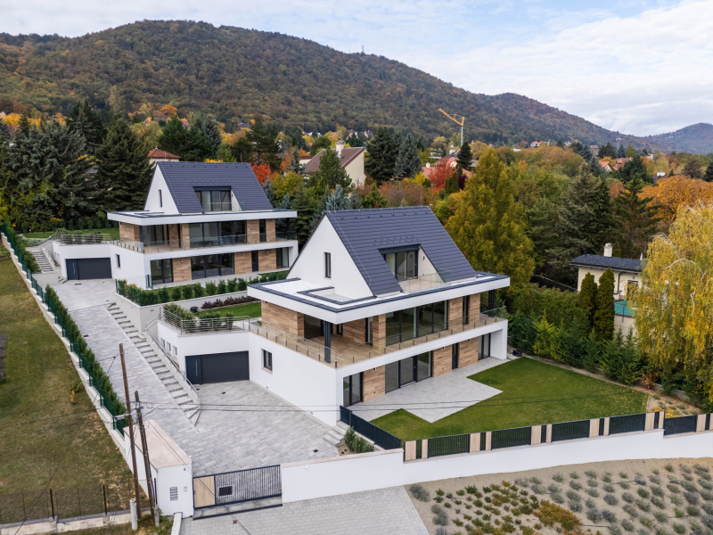 A projektben két modern, letisztult vonalvezetésű épület kapott helyet, összesen négy tágas, családi otthonnal.