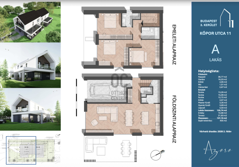 *K-A Lakás:120,74 + Erkély/Terasz:32,41m², Szoba: 4db, Fürdőszoba: 2db, Felszíni parkoló: 2db, Telek: 405,5m² - 216,0 Mft.