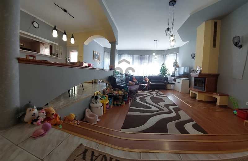 Az lőtér beépített szekrényekkel fogad. A ház központi tere a világos nappali- mely 3 lépcsőfokkal süllyesztett, télen szuper hangulatot, és meleget sugárzó kandallóval.