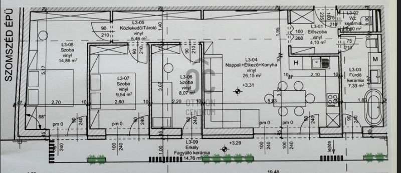 - nappali+ konyha +étkező (26,15 nm) + 3 szoba
