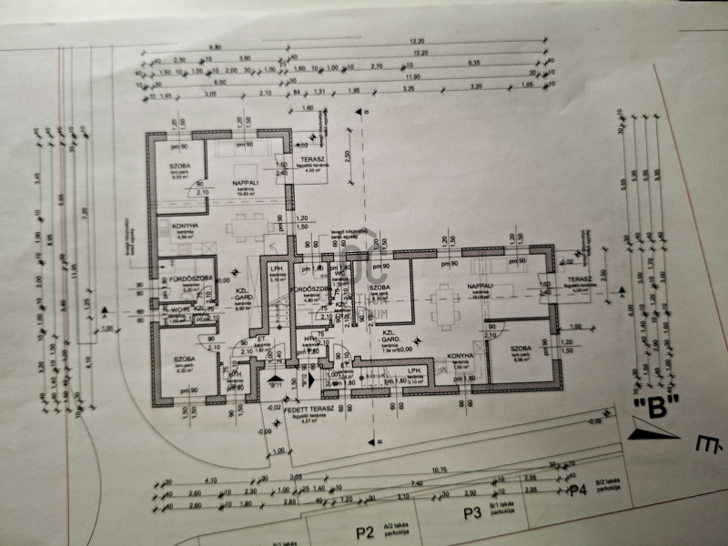 Emelet: két hálószoba (köztük egy 28 m²-es), fürdőszoba-WC, 22,44 m²-es terasz