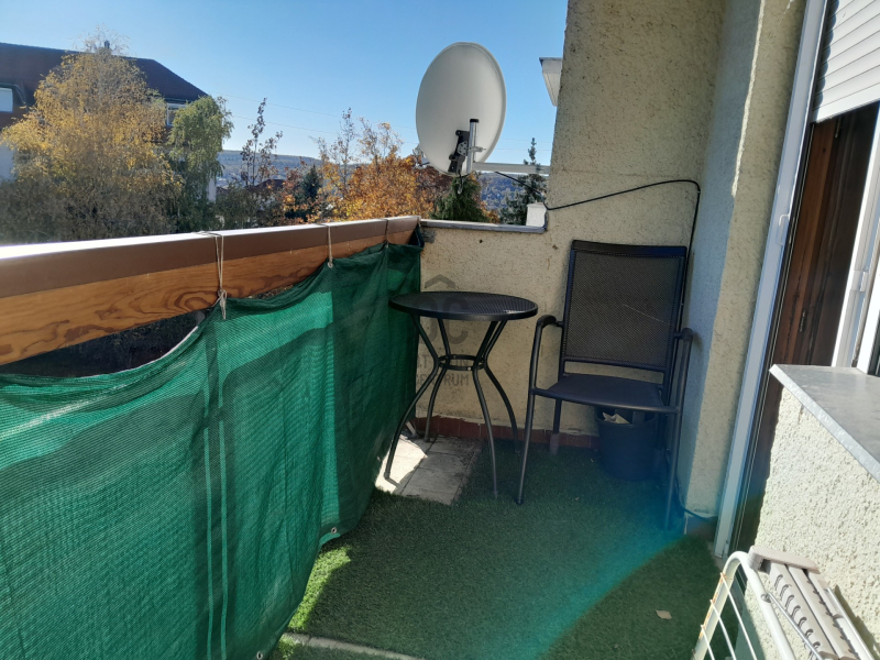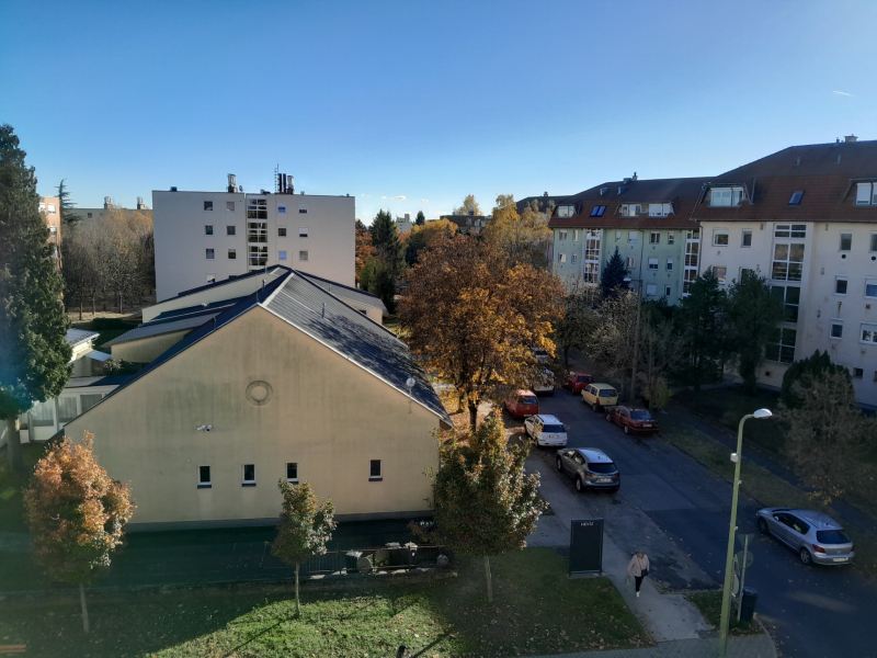 A lakás egy háromszintes társasház legfelső emeletén van, a déli fekvésű erkélyről szép kilátást kapunk a városra.