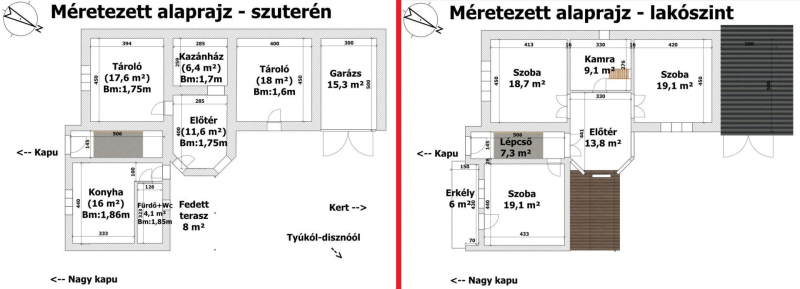 A ház alsó, szuterén részének belmagassága 190 cm alatti, nincs hozzászámolva a lakóterülethez.